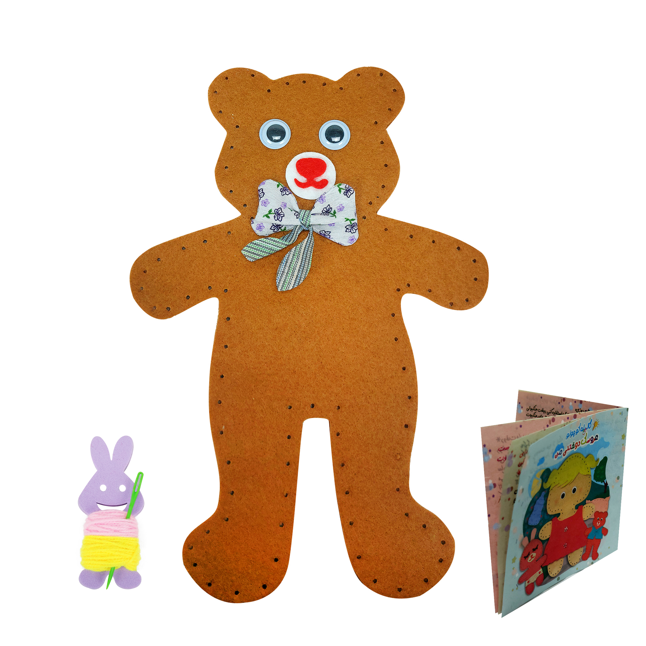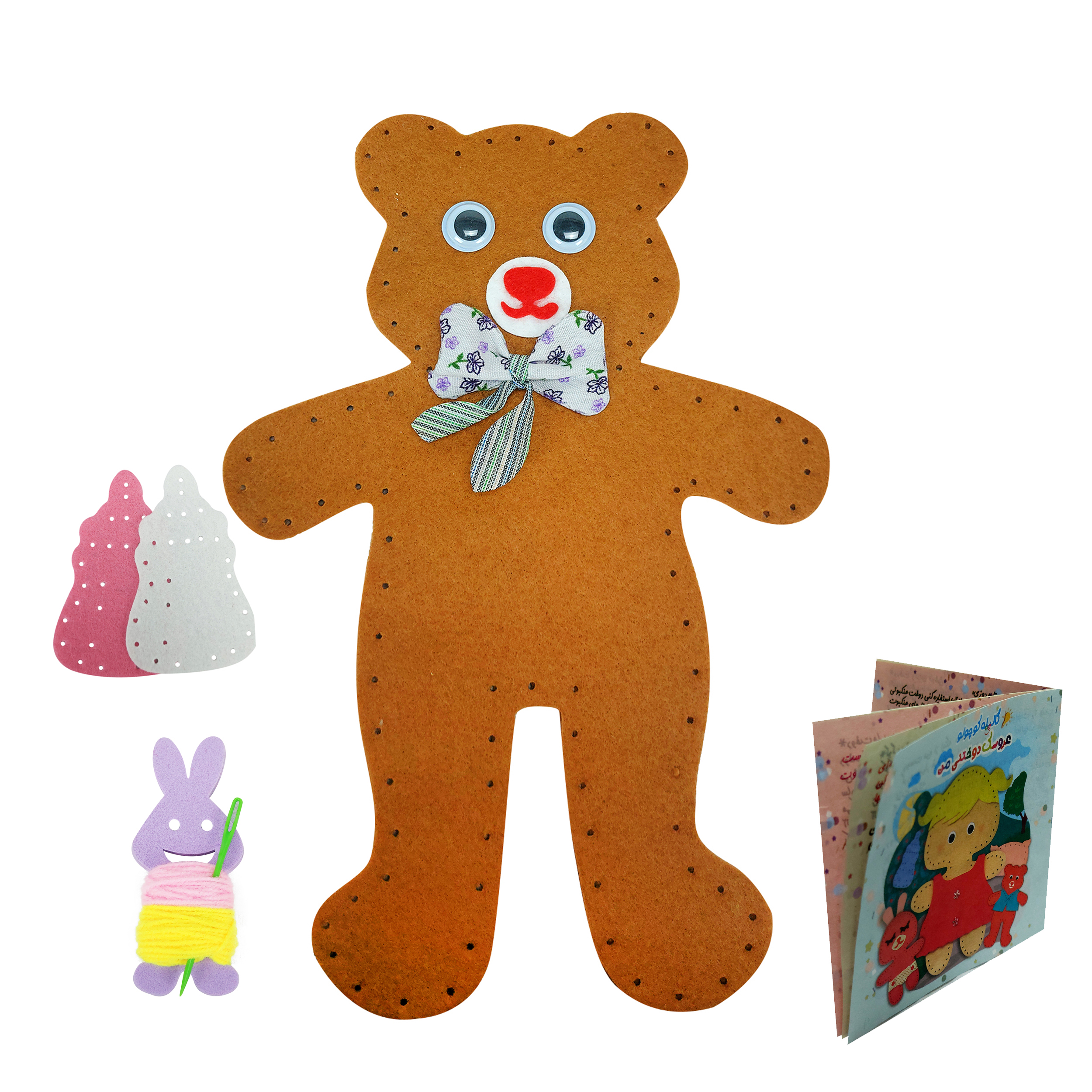پک عروسکسازی شامل قطعات نمدی برشخورده، الیاف نرم و یک سوزن سرگرد پلاستیکی و ایمن است. کودک پس از دوختن قطعات و پر کردن آن با الیاف میتواند یک عروسک تدی خرسه بامزه بسازد و از بازی با آن لذت ببرد. صفحات نرم و سبک، تجربه لمس دلنشینی ایجاد میکنند و فعالیت دوخت کاملاً ایمن است. این بسته تجربهای آموزشی، سرگرمکننده و خلاقانه برای کودک فراهم میکند.