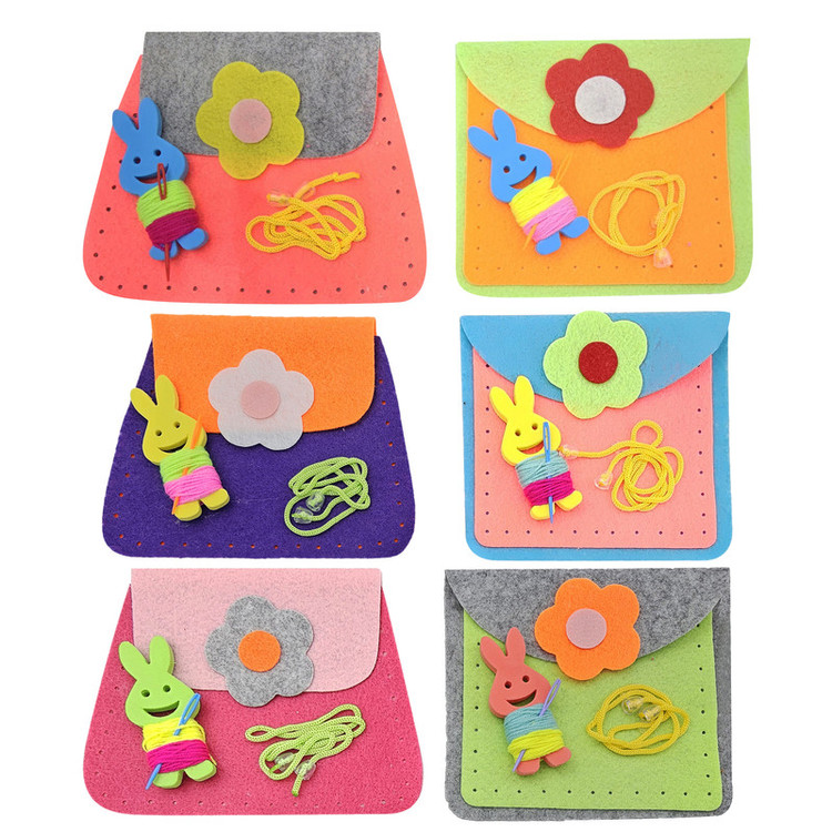 این پک 6 تایی، شامل کیف های برش خورده ای است که محیط آنها پانج شده و سوراخ خورده است. کودکان میتوانند با سوزن پلاستیکی این کیفها را بدوزند و از دست دوزهای خود استفاده کنند.