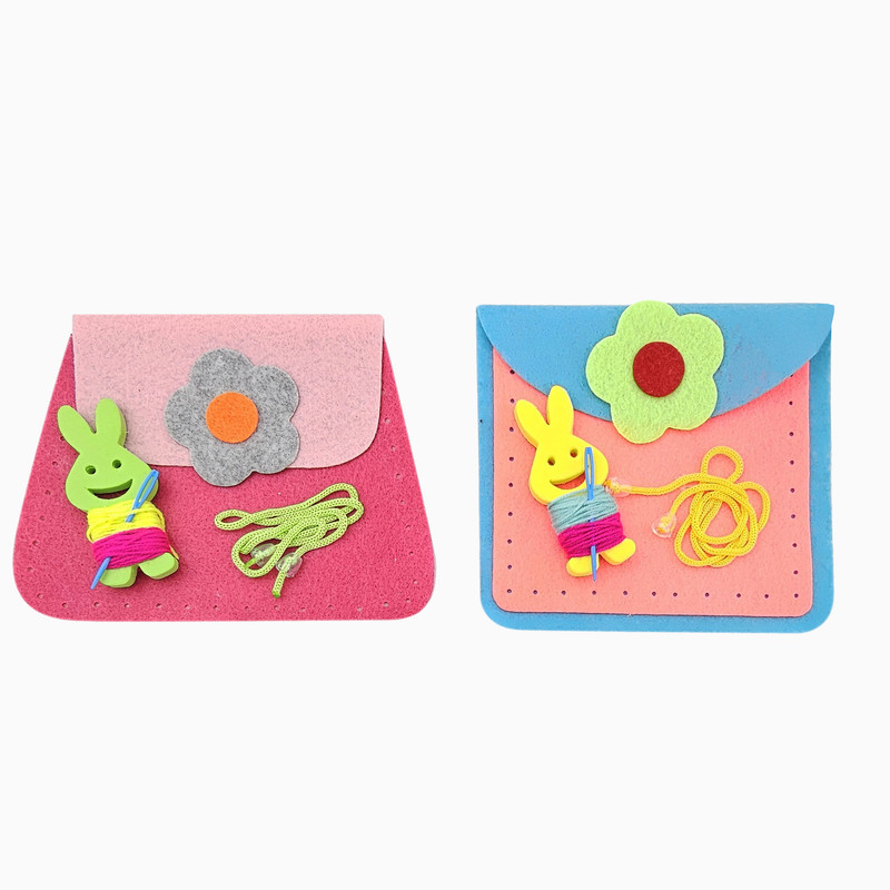 این پک 6 تایی، شامل کیف های برش خورده ای است که محیط آنها پانج شده و سوراخ خورده است. کودکان میتوانند با سوزن پلاستیکی این کیفها را بدوزند و از دست دوزهای خود استفاده کنند.